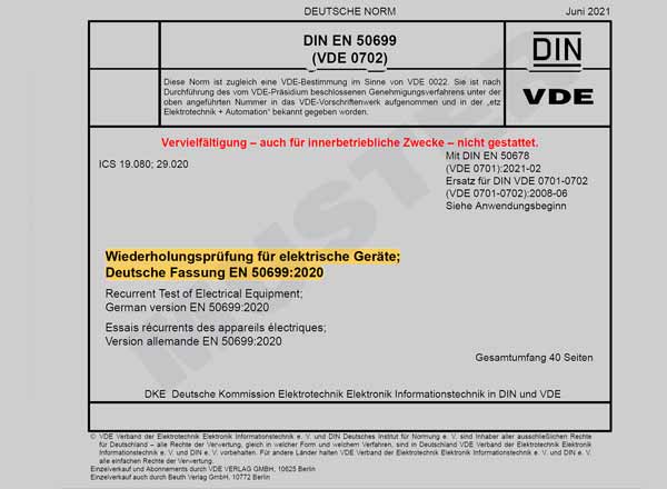Die alte Norm DIN VDE 0701 - 0702 (VDE 0701-0702):2008-06 wurde in 2021 überarbeitet, in die beiden Normen VDE 0701 und VDE 0702 aufgeteilt: